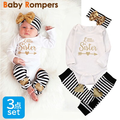 長袖ロンパースとボーダー&ハートのモチーフがかわいいレッグウォーマー、お揃いのヘッドドレス3点がセットになったお得なベビーウェア★